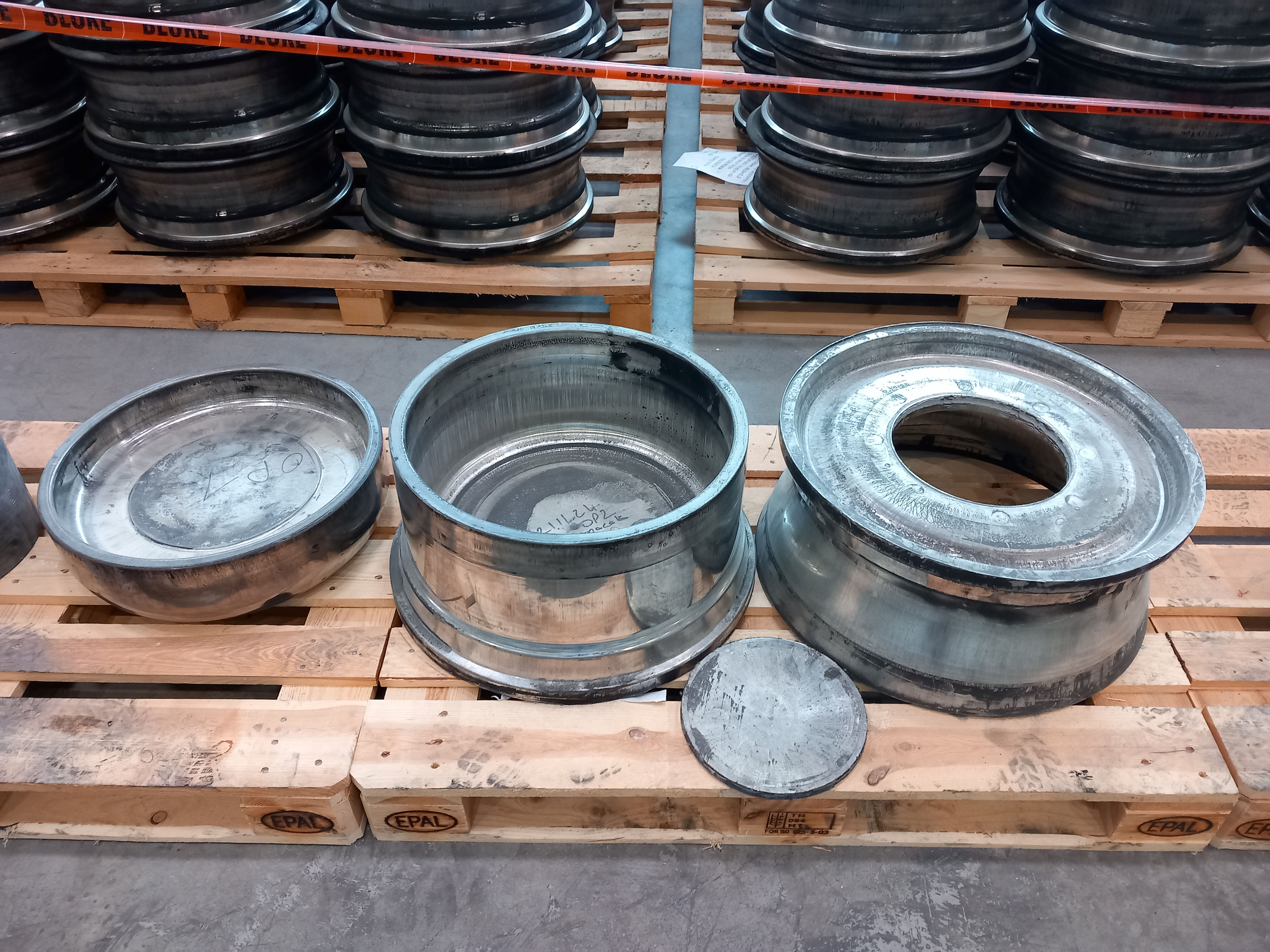 After exiting the furnace, the pieces reach the second part of the forging area. Each piece is successively moulded by three presses, resulting in the basic wheel shape. The first press makes an impression in the centre of the piece, giving it a shallow “bowl” shape. The second 10-000-tonne press results in a much deeper “bowl” with dimensions approximating to the end product. The final press creates the wheel shape. (See the picture below showing the end result of each press, from left to right.)